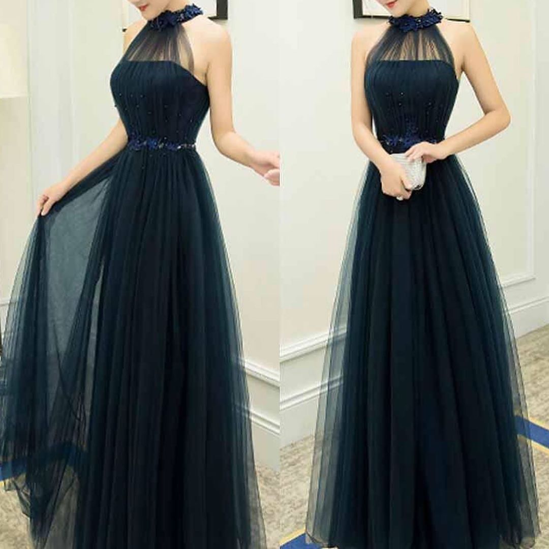 Beautiful Navy Blue Long Prom Dresses with Back Open,Tulle Women Formal Dresses with Pearls