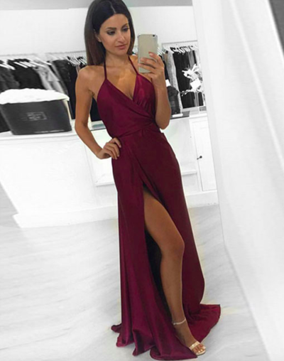 FYD 481,Simple V-neck Burgundy Long Prom Dress with Split