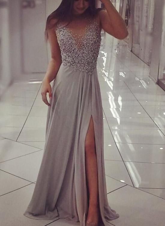 FYD838, Sexy Chiffon Grey Beaded Slit Long Prom Dresses 2018, Long Formal Dresses, Wedding Party Dresses/ friday dresses in new fashion