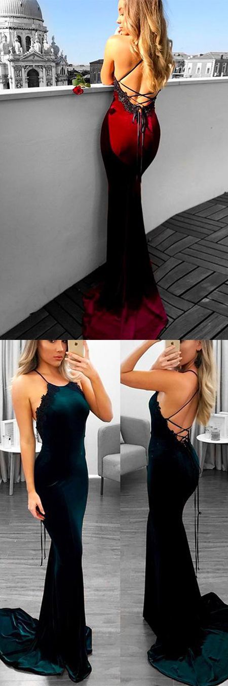 FYD 556,Sexy Mermaid Spaghetti Straps Backless Satin Long Prom/Evening Dress with Lace
