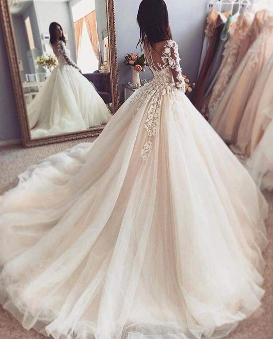 FYD 617,Delicate Lace Tulle Wedding Dress Ball Gown Floral Appliques Long Sleeve Princess Bridal Gowns