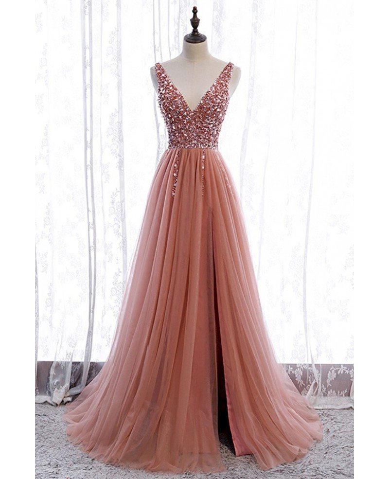 FYD818,Spaghetti Straps Beading Long Prom Dresses Floor Length Tulle Evening Dresses V-neck Womens Dresses