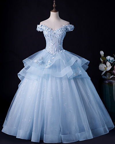 FYD015,Blue Tulle Off Shoulder Long Formal Prom Gown, Layered Evening Dress With Applique