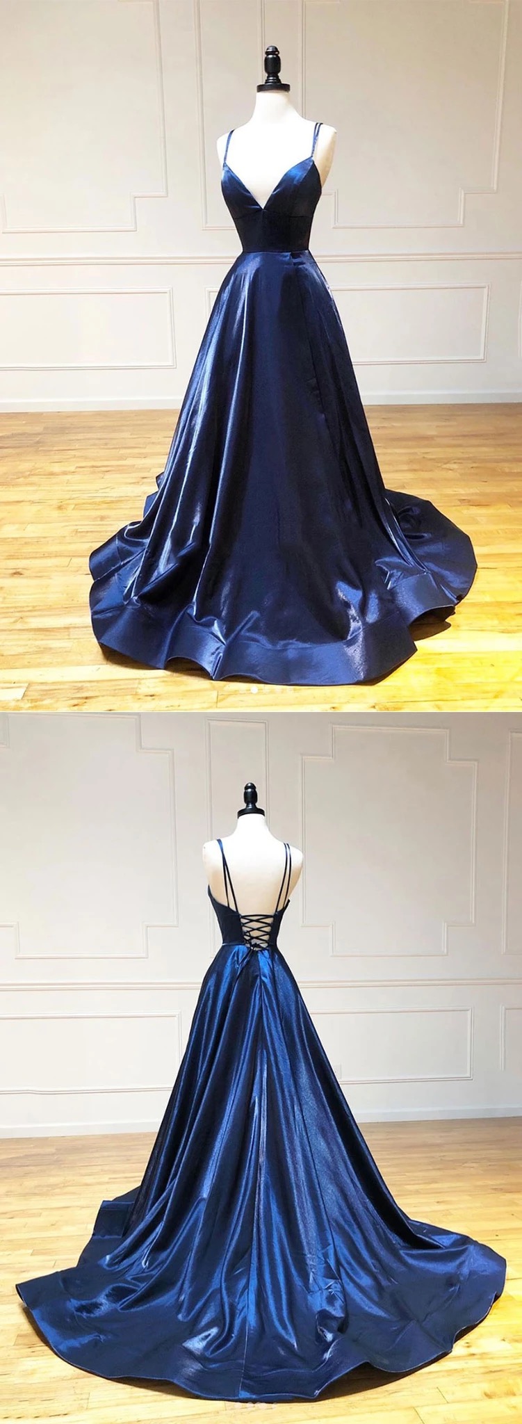 FYD040,Deep Blue Satin Prom Dresses Long Spaghetti Straps Open Back Lace Up Prom Dresses