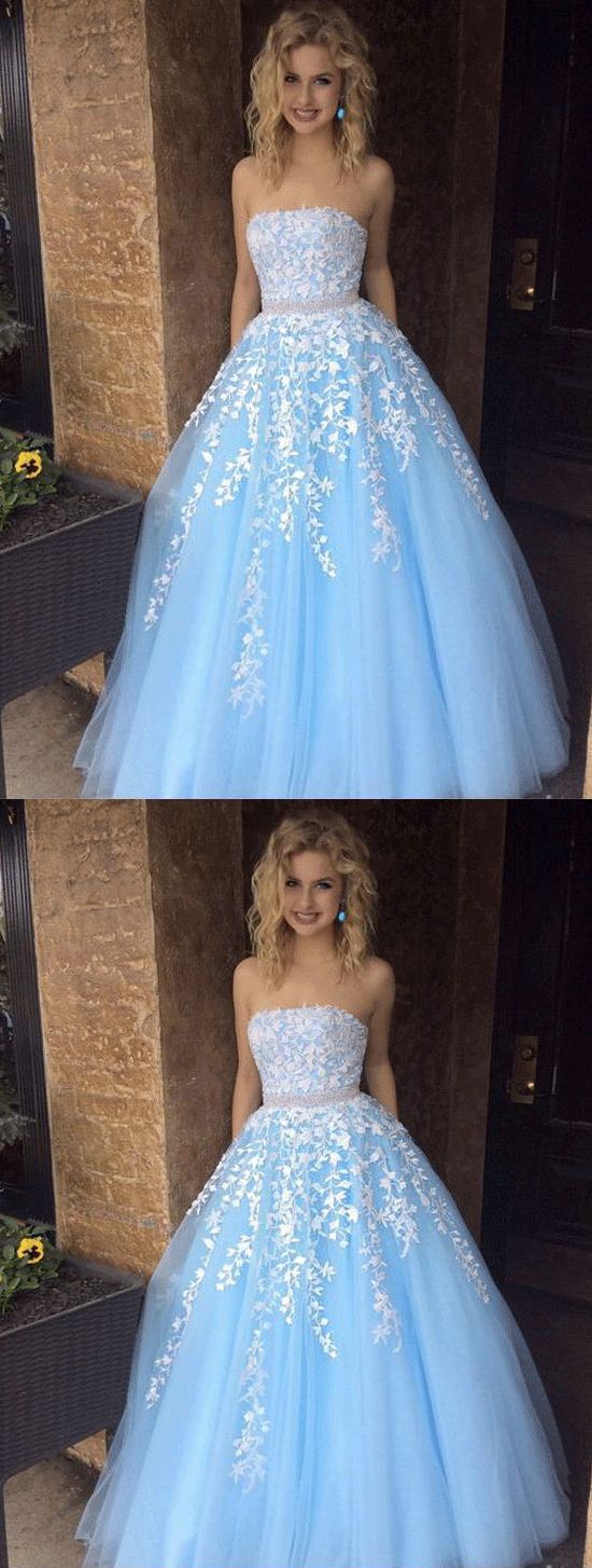 FYD048,Appliqued Tulle Prom Dresses Long Strapless Sleeveless Prom Dresses