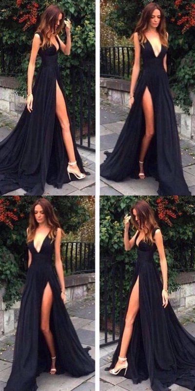 FYD061, Black prom dresses deep v neck evening dresses side slit prom dresses for women