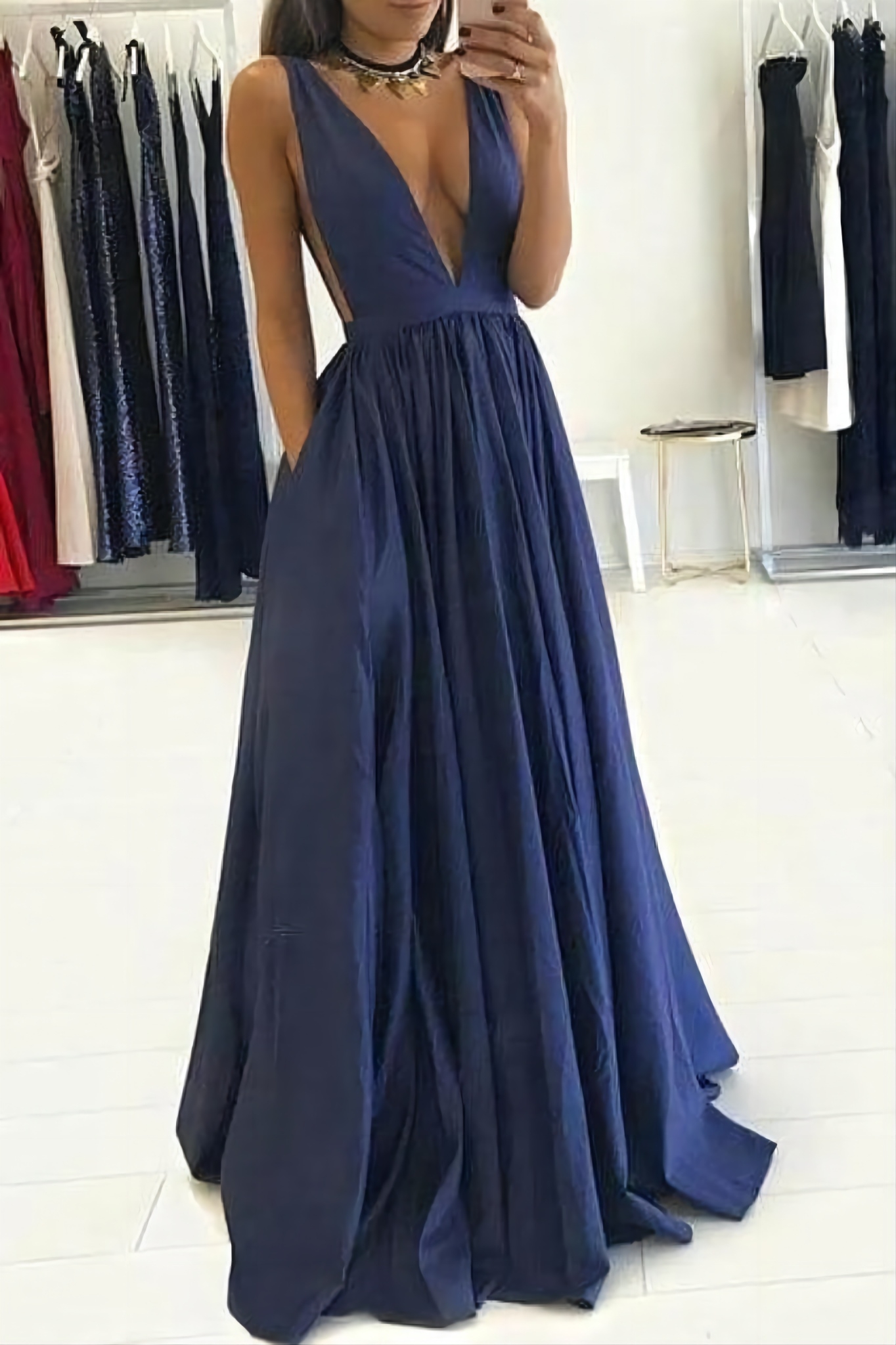 FYD063, Sexy A-Line Deep V-Neck Dark Blue Prom Dresses with Pockets