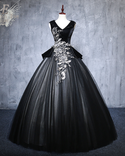 FYD080,Black Tulle Long V Neck Customize Formal Prom Dress, Evening Dress With Applique