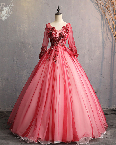 FYD081,Red Tulle V Neck Long Sleeve Formal Prom Dress, Evening Dress