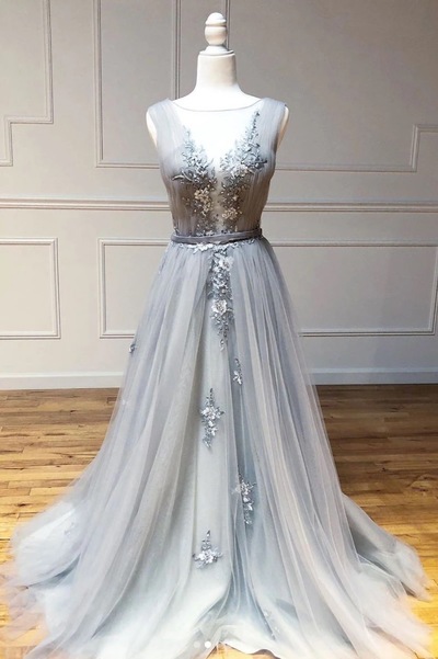 FYD089,Grey Tulle Lace See Through Long Round Neck Formal Prom Dress, Evening Dress