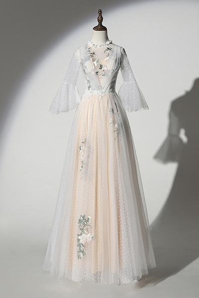 FYD102,White Dotted Tulle Embroidery Lace O Neck Long Prom Dress With Sleeve