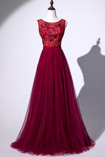 FYD108,Unique Burgundy Tulle Lace Open Back Long Prom Dress