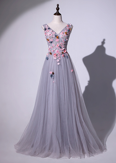 FYD109,Gray Tulle V Neck 3D Lace Applique Long Prom Dress, Formal Dress