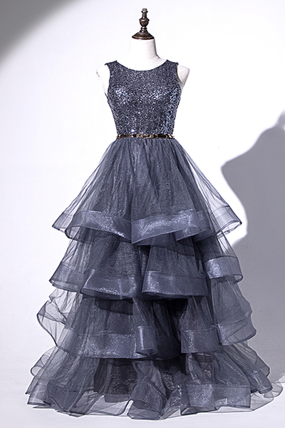 FYD110,Deep Gray Sequins Tulle V Neck Long Layered Prom Dress, Evening Dress