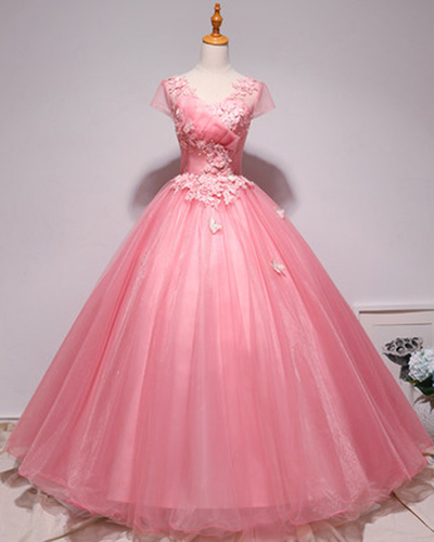 FYD112,Unique Pink Tulle Beaded Long Lace Up Prom Dress, Evening Dress With Applique