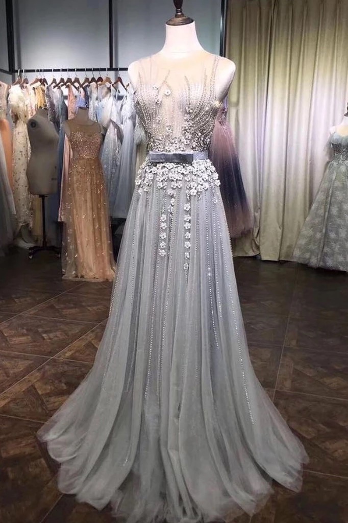 FYD124,Gray Tulle 3D Flower Lace Applique Long Senior Prom Dress, Evening Dress
