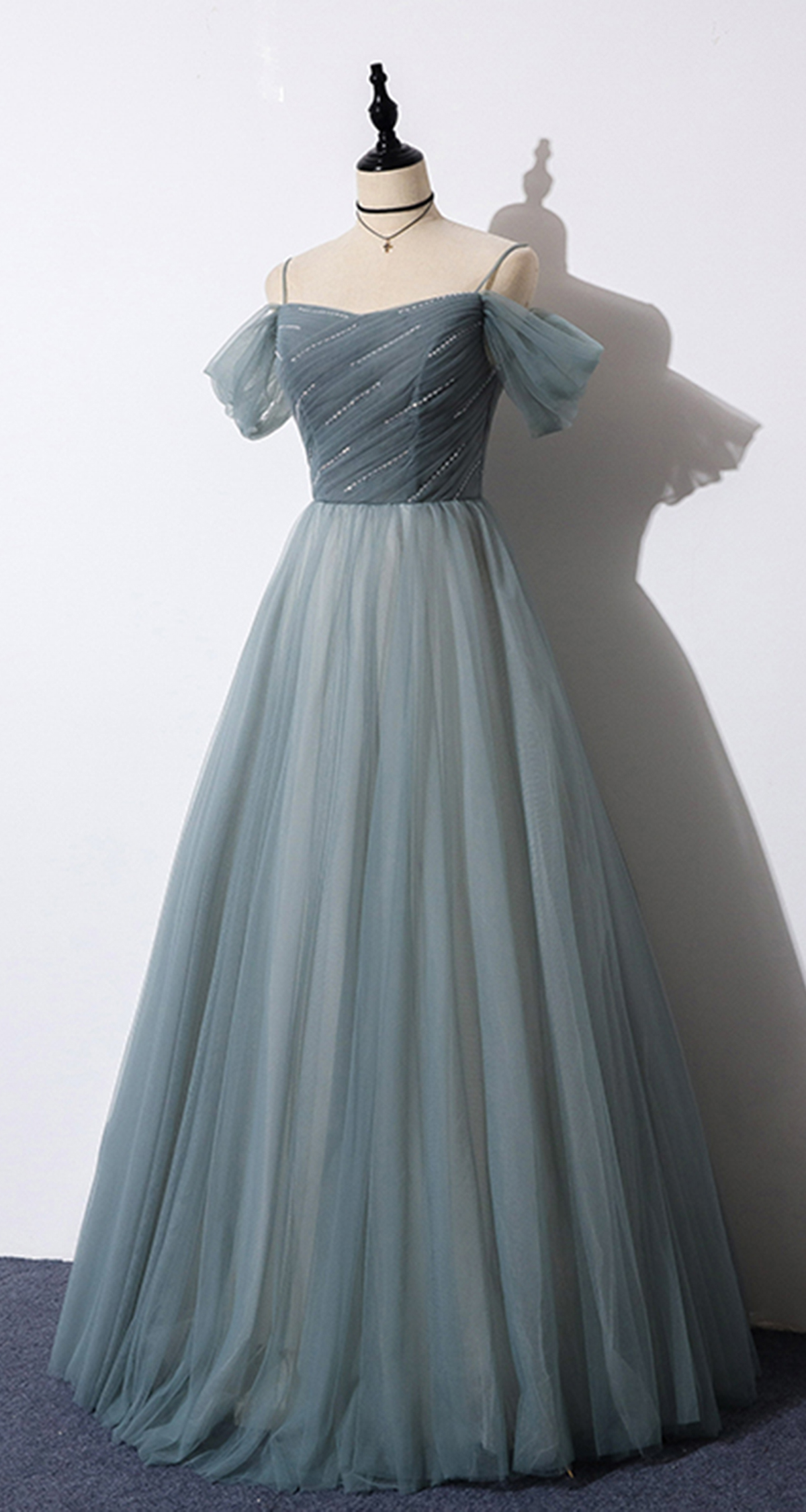 FYD128,Blue Gray Tulle Sequins Off Shoulder Floor Length Prom Dress, Formal Dress With Sleeve