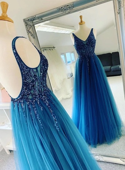 FYD130,Blue Tulle Sequins Open Back Long Custom Made Prom Dress, Evening Dress