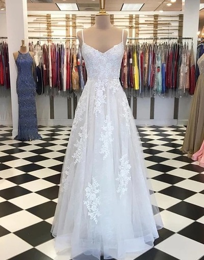 FYD132,Creamy Tulle V Neck Custom Made Long Prom Dress, Evening Dress With Applique