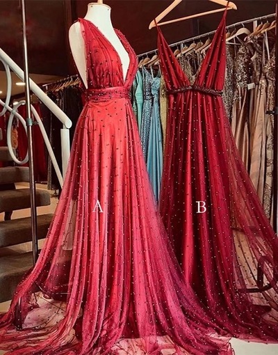 FYD149,Burgundy Beaded Tulle Long Deep V Neck Prom Dress, Evening Dress