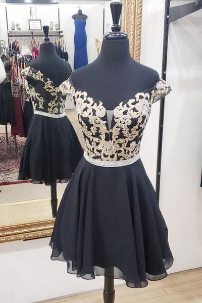 FYD167,Off Shoulder Black Chiffon Short Prom Dress, Homecoming Dress With Lace Applique