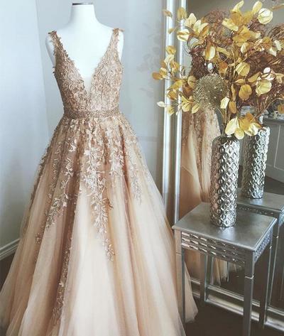 FYD174,New Arrival Champagne Tulle Lace Applique Long Beaded Waistline Prom Dress, Formal Dress