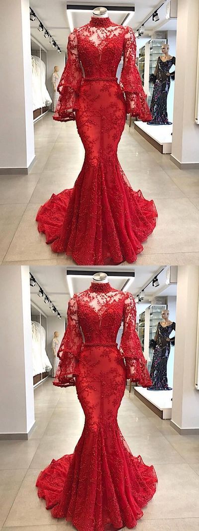 FYD199,Long Sleeve High-Neck Long Red Prom Dresses