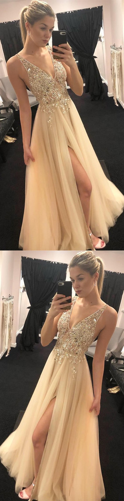FYD203,V-Neck Beaded A-Line Long Prom Dress