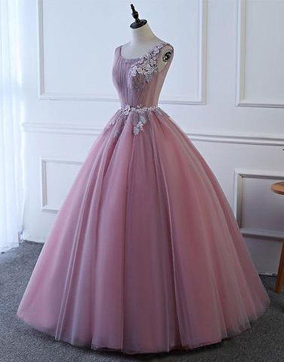 Pink tulle floor length senior prom dress with lace appliqués, long A-line halter evening dress