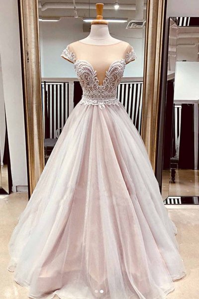 Short Sleeve A-Line Lace Prom Dress,Fancy Evening Dress,Prom Dresses