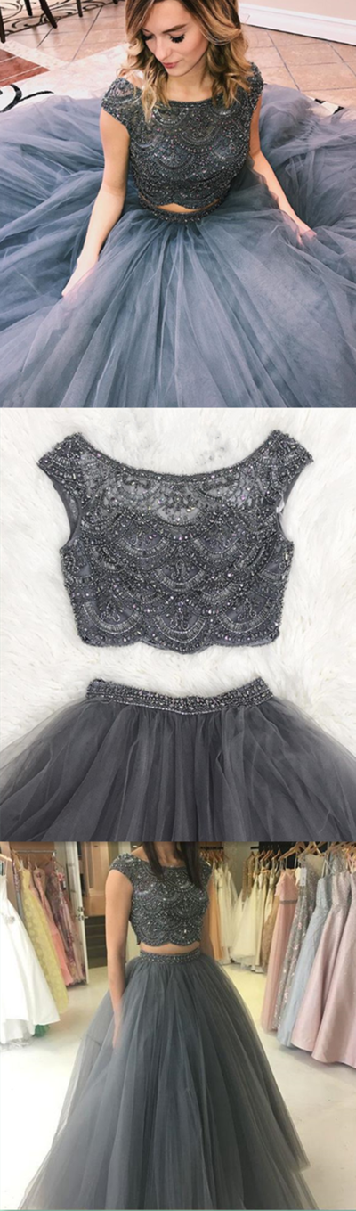 Two Pieces Gray Prom Dress,A-Line Evening Dress,Prom Dresses