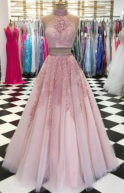 Two Pieces Beaded Pink Prom Dress,A-Line Evening Dress,Prom Dresses