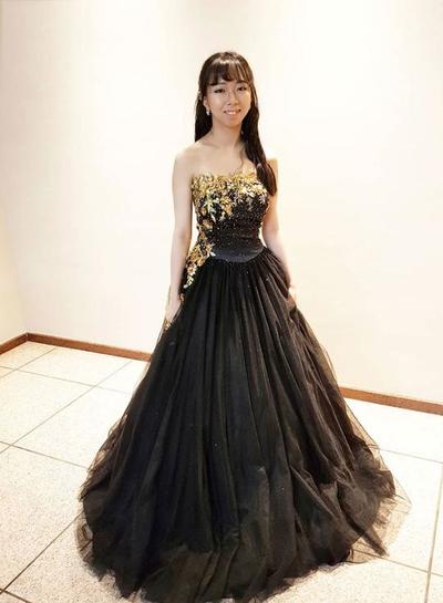 FYD 402,Strapless Black Tulle Gold Lace Long Strapless Prom Dress, Evening Dress
