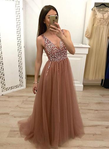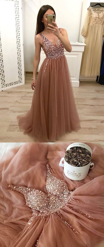 FYD 411,Unique Long Tulle V Neck Sleeveless Beaded Prom Dress