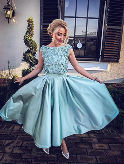 FYD 413,Blue Satin Cap Sleeve Long Lace Evening Dress, Prom Dress