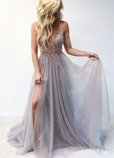 FYD 415,Gray Tulle Spaghetti Strap V Neck Beaded Slit Prom Dresses