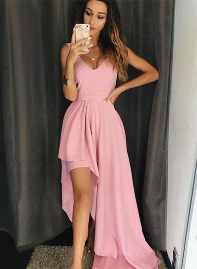 FYD 429,Simple pink v neck chiffon high low prom dress, pink party dress