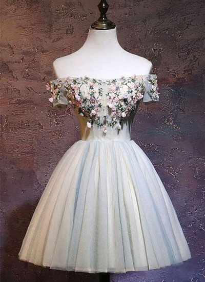 FYD 432,Gray tulle off shoulder mini lace appliqué prom dress, party dress