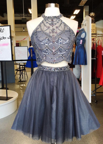 FYD 441,Shinning rhinestone strapless two pieces short homecoming dress, short gray tulle party dress