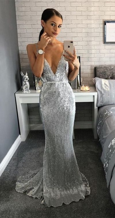 FYD 504,Fashion Silver Sequined Mermaid Prom Dresses, Sexy Deep V Neck Long Prom Party Gowns