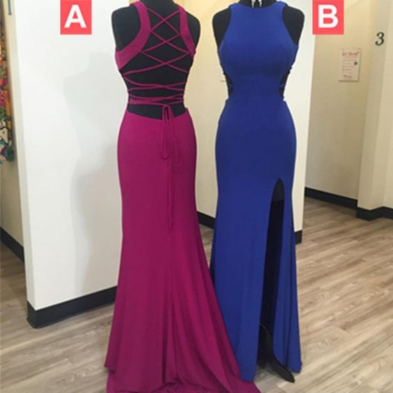 FYD 521,Blue Lace-Up Side-Slit Satin Prom Dresses Evening dresses