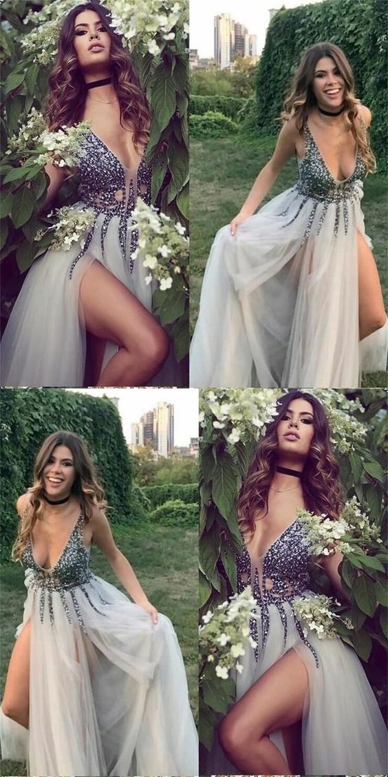 FYD 557,Sparkly A-Line V-Neck Split Front Long Tulle Prom/Evening Dress with Sequins
