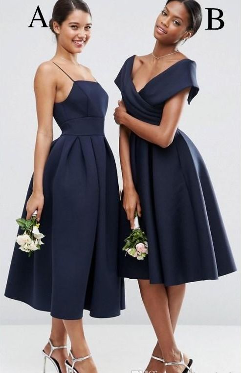 FYD 650,Vintage Navy Blue Off the Shoulder Bridesmaid Dresses Tea Length Satin Bridesmaid Prom Gowns Wedding Party Vestidos