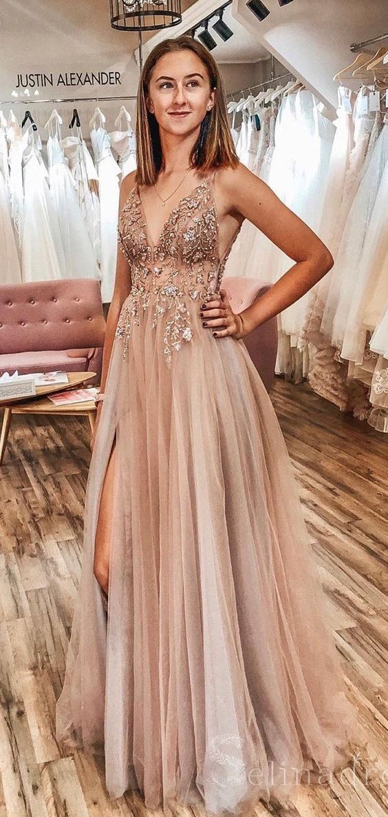 FYD 670,Gorgeous A-Line Spaghetti Straps V Neck Tulle Prom Dresses