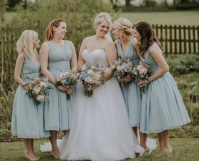 FYD683,Elegant A Line V Neck Blue Tea Length Bridesmaid Dresses/ friday dresses in new fashion