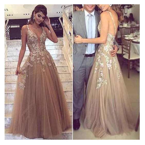 FYD 774,Beautiful Prom Dresses, A-Line Deep V-Neck Champagne Tulle Prom Dress with Appliques/ friday dresses in new fashion
