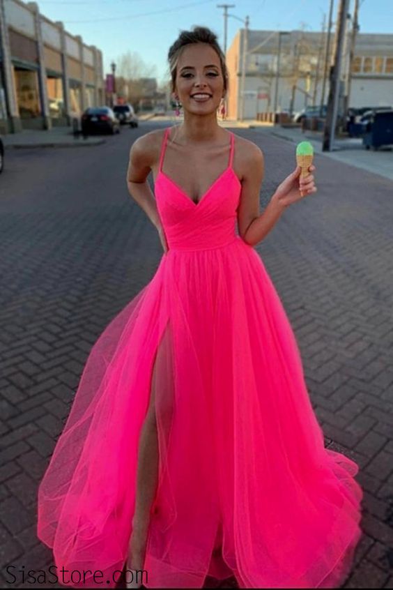 FYD 788,Modest Tulle V Neck Spaghetti Straps Pink Long Prom Dresses/ friday dresses in new fashion