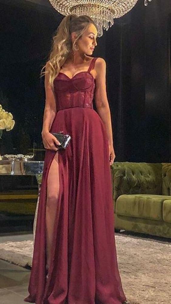 FYD 808,burgundy sleeveless v-neck prom dress,satin lace slit-skirt evening dress/ friday dresses in new fashion